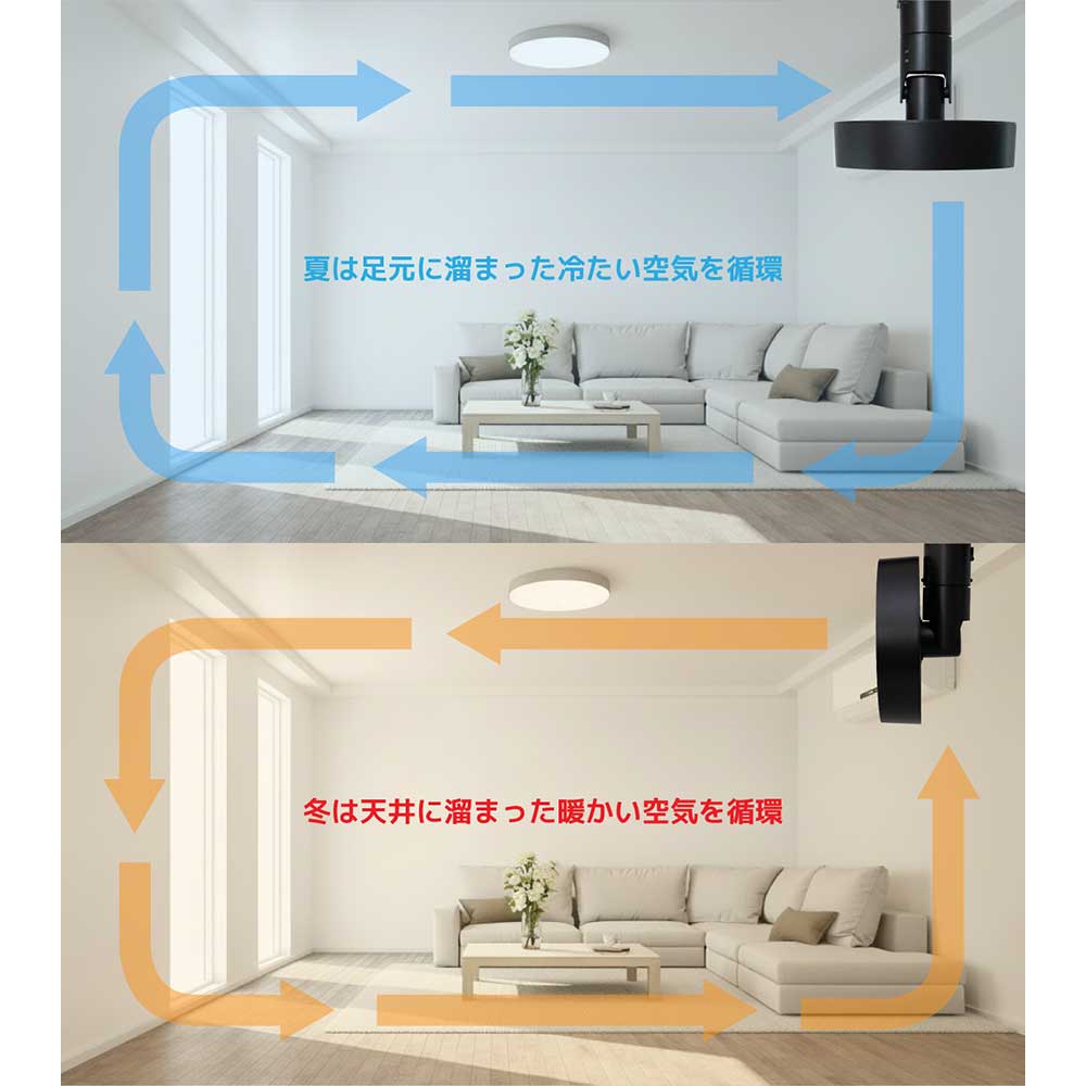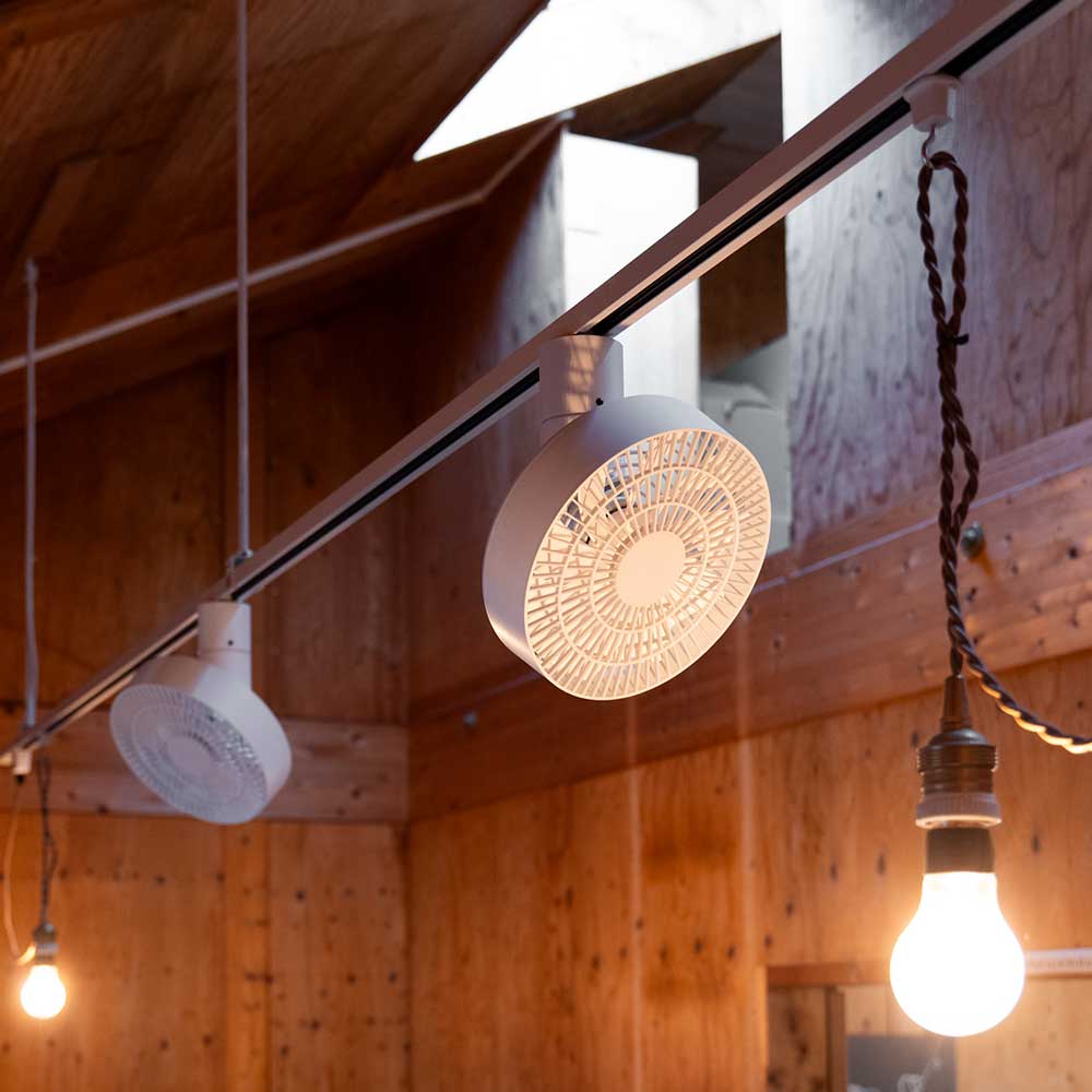 | 従来のダクトレールファンと比べてより立体的に空気を循環させる機能を搭載した新型「DUCT RAIL FAN 3D」。 風向調整は付属のリモコンで前後・左右の風向調整が自動で簡単にできます。スッキリとしたデザインでダクトレール取り付け部も一体型となっている為、天井との隙間も無く自然と空間に馴染みます。 5m以上先まで風を届けられる大風量タイプで、キッチンやお部屋の隅など空気が溜まりやすい環境でも大活躍。 床置きタイプのサーキュレーターと同等の機能でありながら天井への取り付けタイプなので、いつも通りの動線のままでしっかりと空間に風を送れる、使い勝手に優れたファンです。